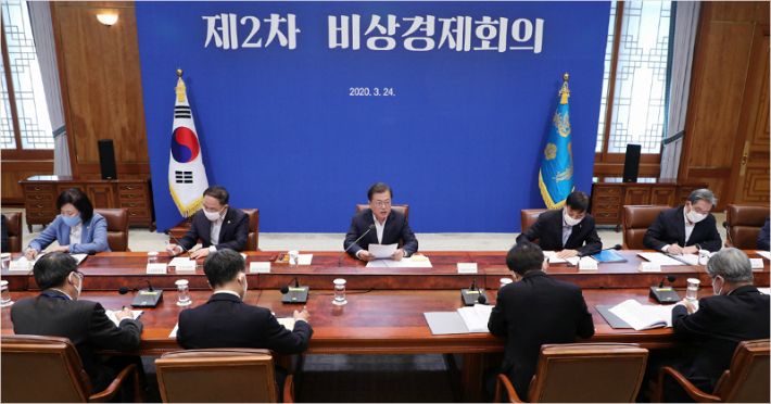 문재인 대통령이 24일 청와대에서 코로나19 관련 2차 비상경제회의를 주재하고 있다.(사진=연합뉴스)