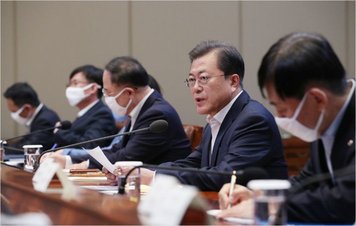문 대통령은 "(기업구호 긴급자금 추가 투입은) 소상공인과 중소기업을 넘어서 주력 산업 기업까지 확대하고 비우량기업과 우량기업 모두를 포함해 촘촘하게 지원하는 긴급 자금"이라며 "우리 기업을 지켜내기 위한 특단의 선제 조치임과 동시에 기업을 살려 국민들의 일자리를 지키는 일이기도 하다"고 설명했다.