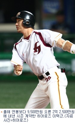 히어로즈는 19일 이택근과 올해 1억 3,000만원에서 9,500만원(73.1%) 오른 2억 2,500만원에 내년 연봉 계약했다고 밝혔다. 이택근은 올시즌 타율 3할1푼7리 12홈런 58타점을 기록했고 베이징올림픽 금메달을 따냈다.