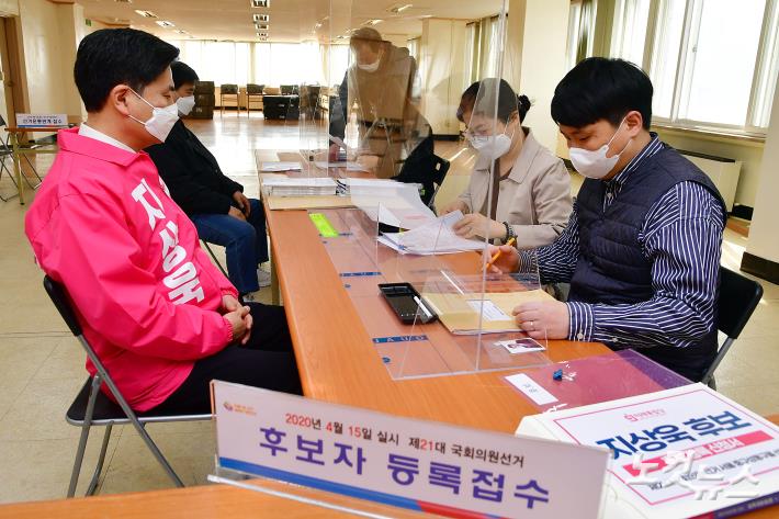 26일 오전 종로구선거관리위원회에서 미래통합당 지상욱 후보가 21대 총선 서울 중구성동구을 국회의원 후보자 등록 접수를 하고 있다.