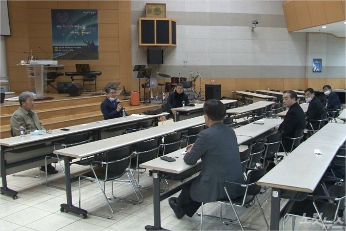 인천기독교총연합회 각 구 연합회장과 공동회장 등이 30일 모여 2020 부활절새벽연합예배 개최 여부를 논의하는 모습. (사진=인천기독교총연합회 제공)
