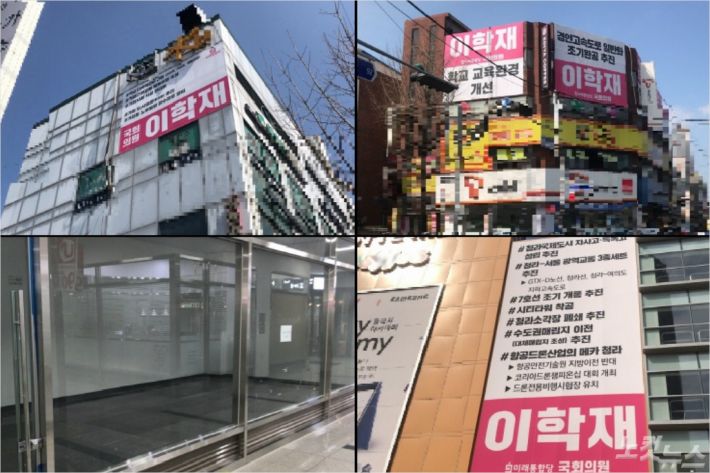 이학재 의원 측이 서구 지역내 각각 다른 건물에 게시한 대형 현수막들과 공실 상태인 지역 사무실 모습. (사진=더불어민주당 공정선거감시단 제공)