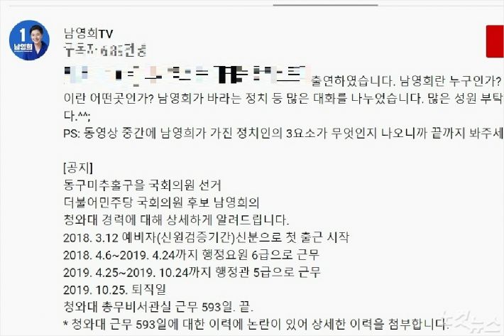 더불어민주당 남영희 인천 동구미추홀을 후보 측이 유튜브에 게시한 글 화면 캡처.