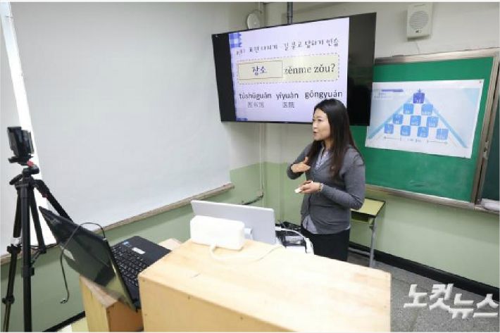 지난 3월 30일 오전 서울 성북구 종암중학교 교실에서 중국어 선생님이 실시간 원격 수업을 진행하고 있는 모습.(사진 = 이한형 기자)