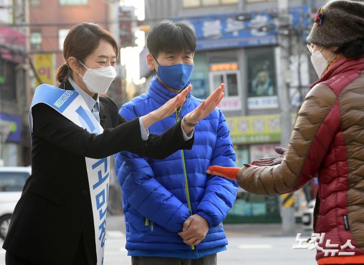 더불어민주당 광진을 고민정 후보가 2일 오전 서울 광진구에서 남편 조기영 시인(오른쪽)과 함께선거 유세를 하고 있다.