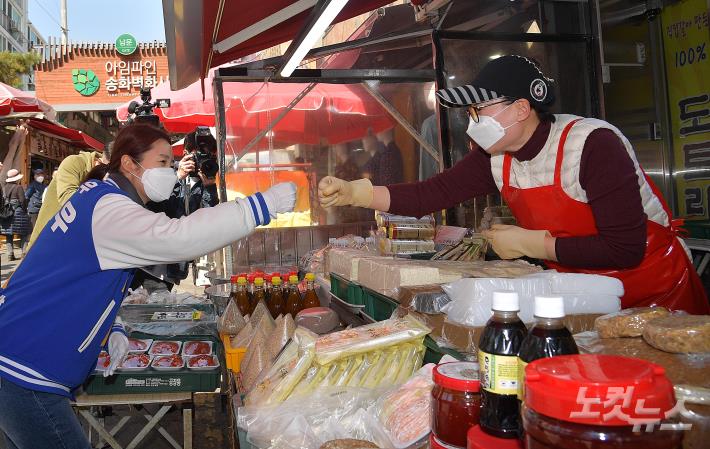 제21대 국회의원선거에서 강서갑에 출마하는 더불어민주당 강선우 후보가 3일 서울 강서구 송화벽화시장에서 소중한 한 표를 호소하고 있다.