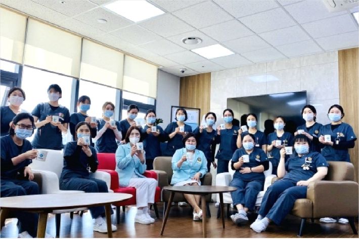 만세365병원 직원들이 머그잔을 들고 친환경 실천을 다짐하고 있다. (사진=만세365병원 제공)