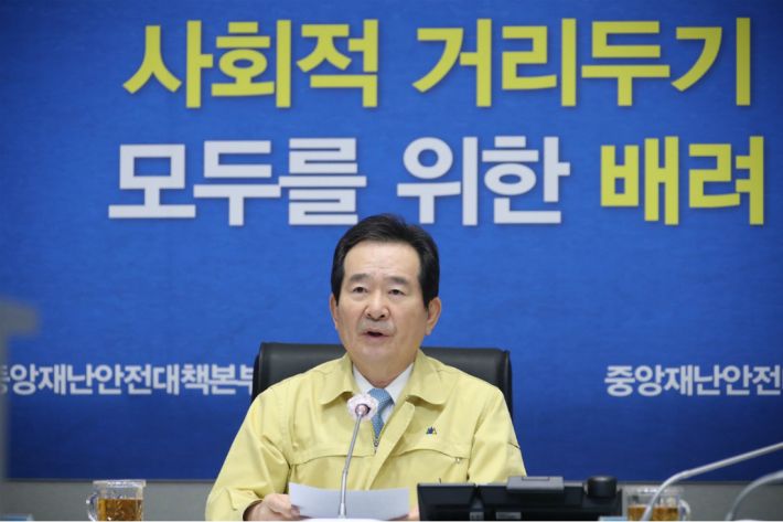 정세균 국무총리가 6일 오전 정부서울청사 중앙재난안전상황실 서울상황센터에서 열린 신종 코로나바이러스 감염증(코로나19) 대응 중앙재난안전대책본부 회의를 주재하며 발언하고 있다. (사진=연합뉴스)