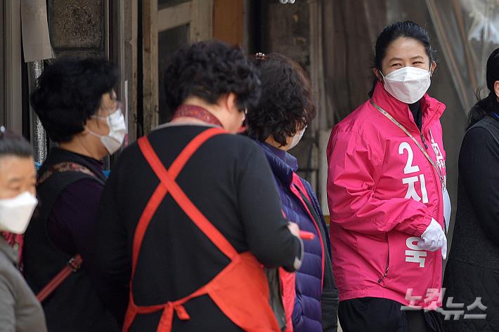 미래통합당 중구성동을 지상욱 후보의 부인인 배우 심은하 씨가 7일 서울 중구 약수시장 앞에서 남편에 대한 지지를 호소하고 있다.