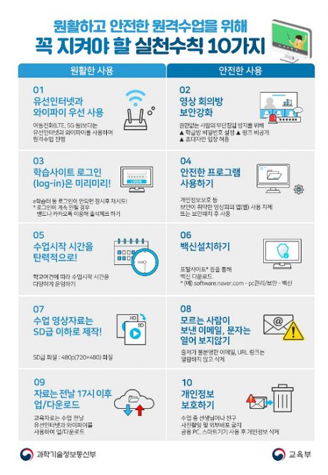 해당 수칙은 각 교육청 홈페이지와 EBS온라인클래스, e-학습터 등 원격 교육 사이트, 한국인터넷진흥원(KISA)의 보호나라 홈페이지 등에서 확인할 수 있다.