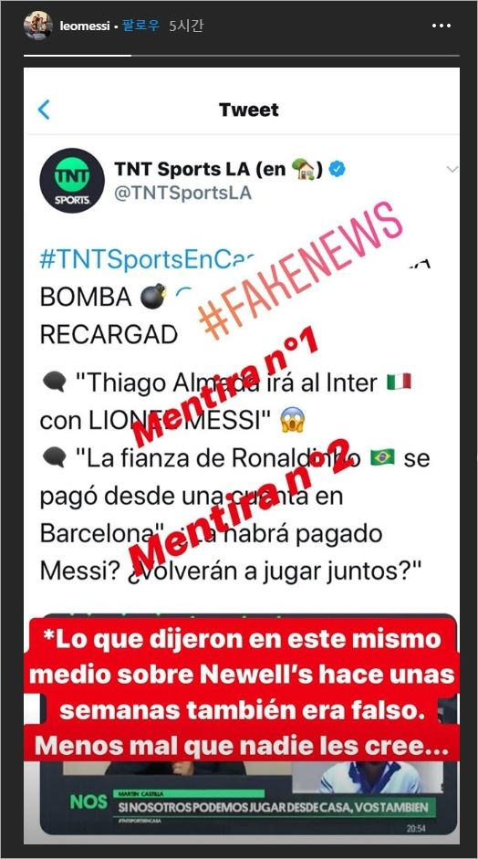 메시는 10일(한국시간) 인스타그램 스토리를 통해 이탈리아 세리에A 인터 밀란 이적 뉴스와 최근 석방된 호나우지뉴의 보석금을 대신 내줬다는 두 가지 뉴스에 대해 '가짜 뉴스(fake news)'라고 강조했다.