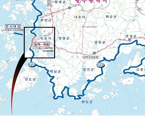 지난 8일 공고된 1공구(신안 압해~목포 율도)와 2공구(목포 달리도~해남 화원) 도로건설공사는 목포, 신안, 해남 3개 시ㆍ군을 해상교량과 해저터널로 잇는 총연장 13.4km의 사업으로 공사 난이도 등을 고려해 2개 공구로 나누어 설계·시공 일괄입찰방식(턴키)으로 추진되며 총사업비는 4,820억원이다.