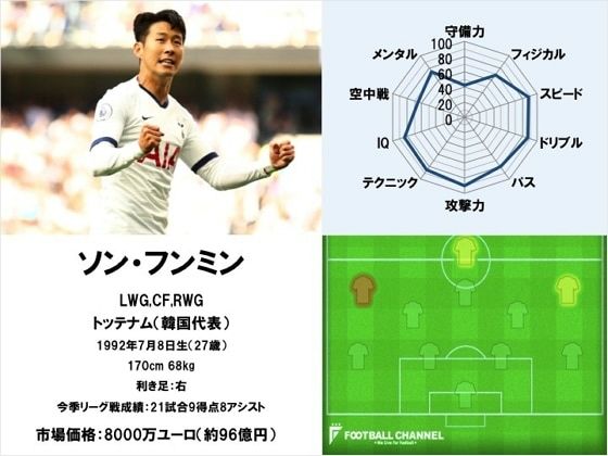 풋볼채널은 "아시아 넘버 원 손흥민은 바이에른 뮌헨(독일), 유벤투스(이탈리아) 등 강호들이 영입에 흥미를 갖고 있는 세계 최고의 공격수"라면서 "날카로운 드리블과 정확한 양발 슈팅으로 상대에게 위협이 될 수 있는 선수다. 한국 대표로는 물론 지난 시즌 20골을 넣는 등 토트넘 공격의 기둥이다. 해리 케인과 조합에서 나오는 파괴력은 토트넘의 자랑 중 하나"라고 평가했다.