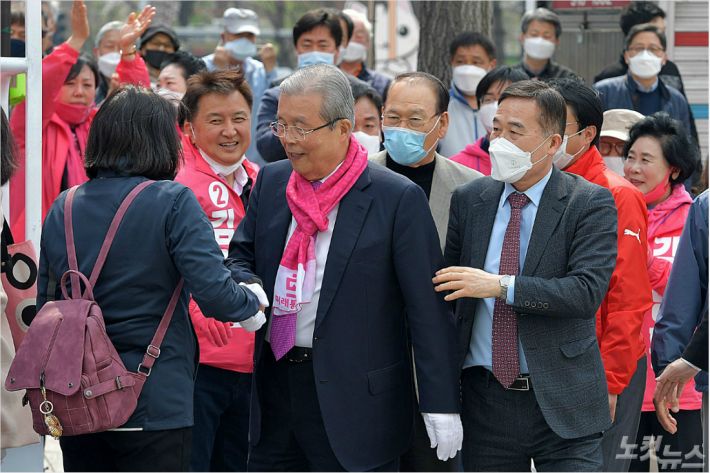미래통합당 김종인 총괄 선거대책위원장이 지난 10일 경기 고양시 주엽역 앞에서 경기 고양시정 김현아, 경기 고양시병 김영환 후보에 대한 지원유세를 마친 뒤 시민들과 인사하는 모습.(사진=박종민 기자)