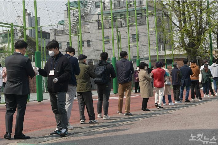 제21대 국회의원선거일인 15일 서울 동작구 강남초등학교 체육관에 마련된 투표소에 유권자들이 줄을 서고 있다. (사진=이한형 기자)