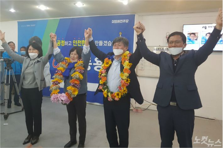 21대 총선 전남 순천·광양·곡성·구레 을 더불어민주당 서동용 후보(왼쪽에서 세번째)가 개표 결과 당선이 유력시되자 지자자들과 함께 환호하고 있다.(사진=서동용 후보측 제공)