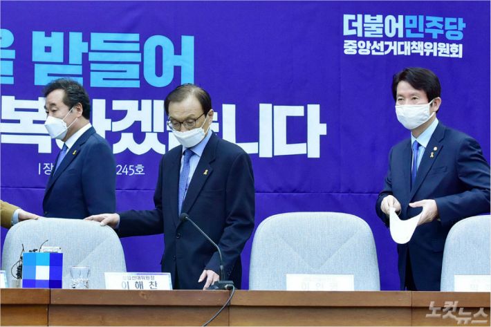 더불어민주당 이해찬 대표와 이낙연 상임선대위원장, 이인영 원내대표 등이 16일 오전 국회에서 열린 더불어민주당 대한민국미래준비선거대책위원회의에 참석하고 있다. (사진=윤창원 기자)