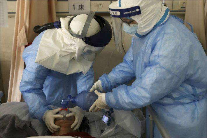 중국 후베이성 우한의 한 병원에서 16일 의료진이 코로나19 환자에게 산소공급 치료를 하고 있다.(사진=연합뉴스)