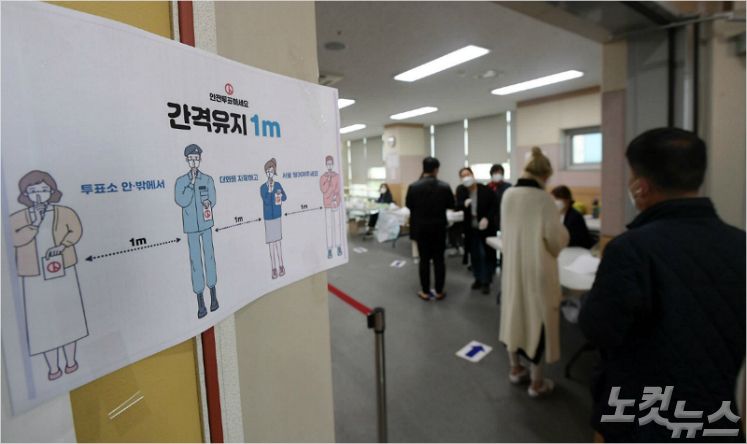 제21대 국회의원 선거일 15일 오전 서울 사당 제1동 제5투표소에서 유권자들이 사회적 거리를 두고 줄을 서고 있다 (사진=이한형 기자)