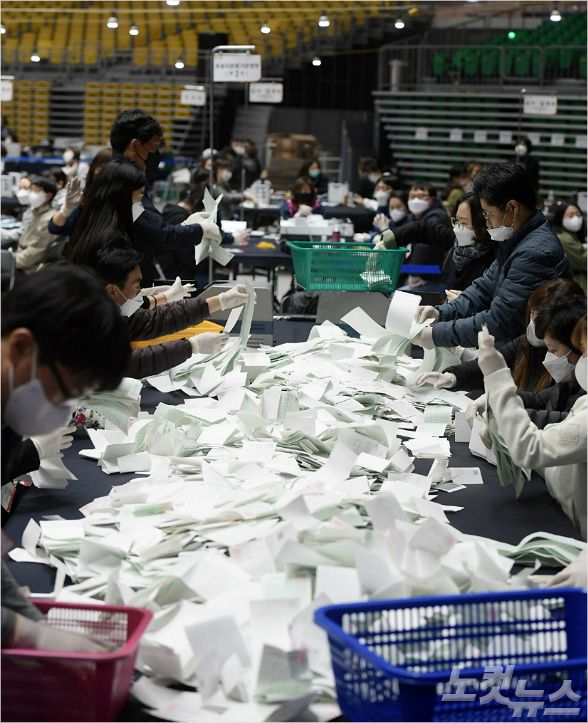제21대 국회의원선거 투표가 종료된 15일 오후 서울 송파구 올림픽체조경기장에 마련된 개표소에서 사무원들이 개표를 하고 있다 (사진=이한형 기자)