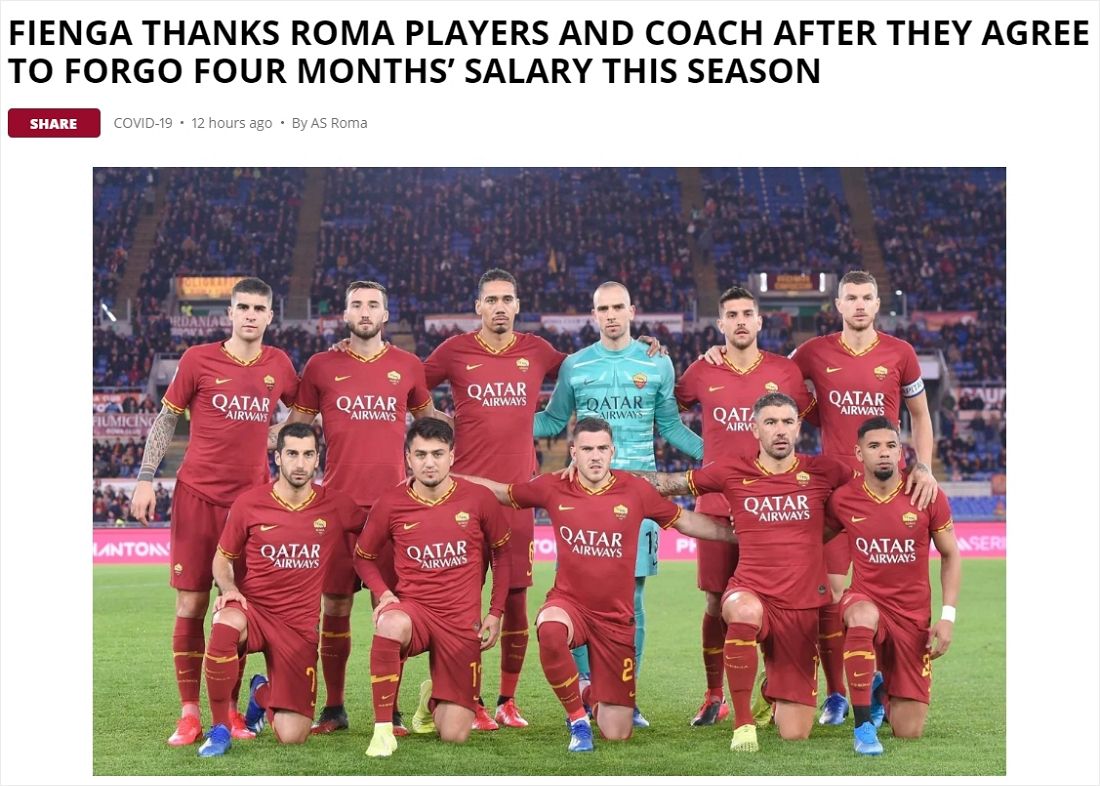 AS로마는 20일(한국시간) 홈페이지를 통해 "최고경영자(CEO) 귀도 피엔가가 4개월 급여를 받지 않기로 한 선수단과 코칭스태프에 감사 인사를 전했다. 선수단은 구단을 돕기 위해 잔여 시즌 받아야 할 급여를 포기했다"고 전했다.