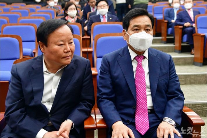 미래통합당 심재철 원내대표(당 권한대행)와 김재원 의원이 20일 오후 국회에서 열린 당 의원총회에 참석해 굳은 표정을 짓고 있다. (사진=윤창원 기자)