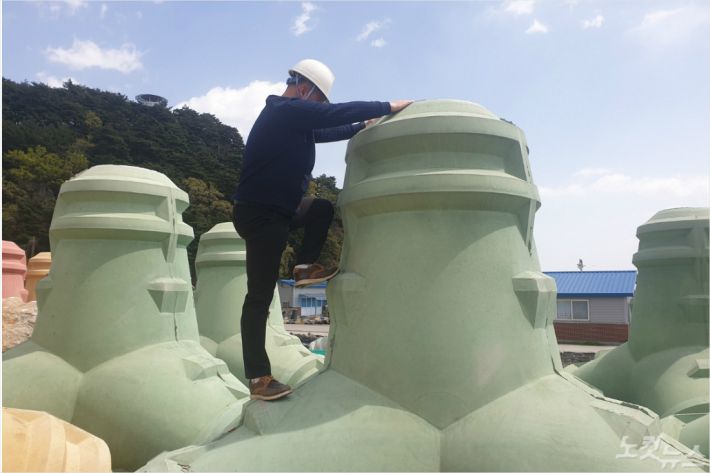 양양 인구항 방파제 연장공사에 투입될 다기능 컬러 테트라포드 안전성을 살피고 있는 양양군청 공무원. (사진=전영래 기자)