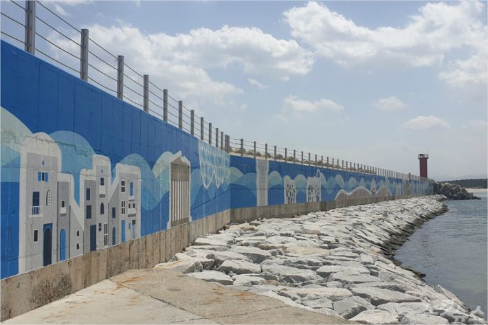 벽화 조성은 방파제 본연의 기능을 유지하면서 관광객들에게 다양한 볼거리나 포토존 제공을 위한 것으로, 바다와 어울리는 푸른색으로 그리스 산토리니 풍경을 담았다.