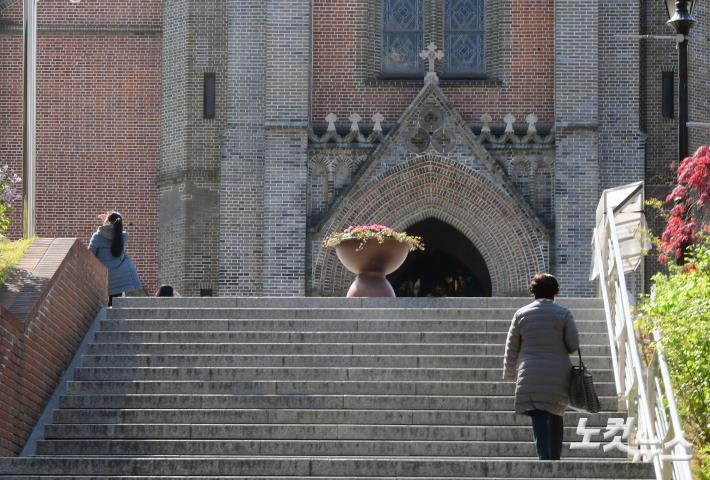 코로나 사태로 중단됐던 천주교 미사가 두 달여 만에 재개된 23일 오전 서울 중구 명동성당에 미사에 참석하기 위해 한 천주교 신자가 계단을 오르고 있다.
