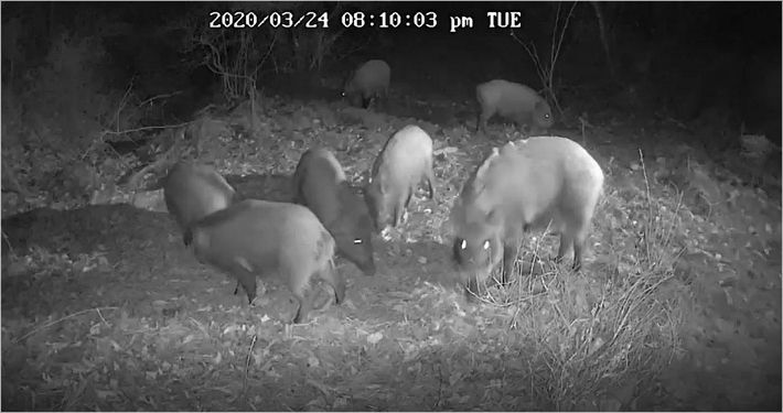 야생멧돼지 출몰이 거의 없는 지역에 암퇘지 분비물을 뿌린 결과 최대 멧돼지 7마리가 모여드는 장면이 폐쇄회로(CC) TV에 찍혔다. (사진=ETRI 제공 영상 캡처)