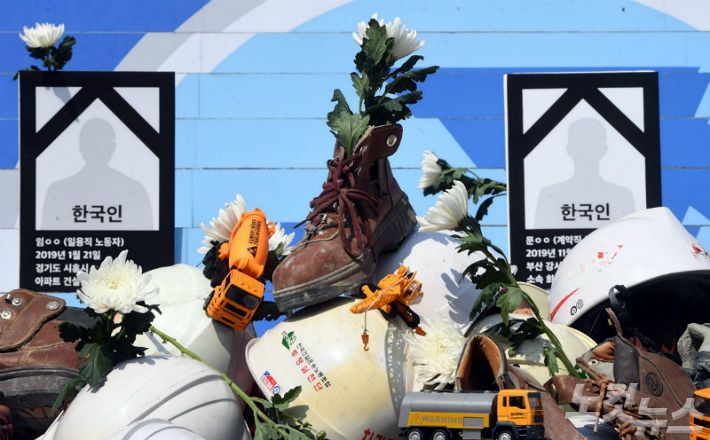 지난 27일 오전 서울 종로구 세종문화회관 계단에서 열린 ‘2020 최악의 살인기업 선정식’ 현장에 산재사망 노동자 상징물이 설치돼 있다. (사진=황진환 기자/자료사진)