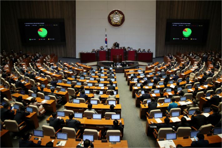 29일 국회에서 열린 제2차 본회의에서 인터넷전문은행 설립 및 운영에 관한 특례법 일부개정법률안이 가결되고 있다. (사진=연합뉴스)
