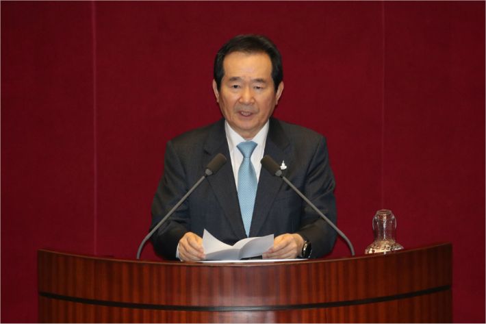 정세균 국무총리가 30일 국회에서 열린 제3차 본회의에서 2020년도 제2회 추가경정예산안 가결 후 인사말을 하고 있다.(사진=연합뉴스)