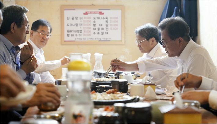 문재인 대통령은 1일 청와대 인근 곰탕집에서 깜짝 점심 식사를 가졌다. 소상공인, 자영업자들이 어려운 상황에서 가급적 식당을 이용해달라는 소비 독려차원이다.