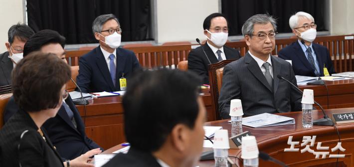서훈 국정원장이 6일 김정은 북한 국무위원장의 동향과 대외정책 등에 관해 국회에서 열린 정보위원회 전체회의에서 보고 준비를 하고 있다.