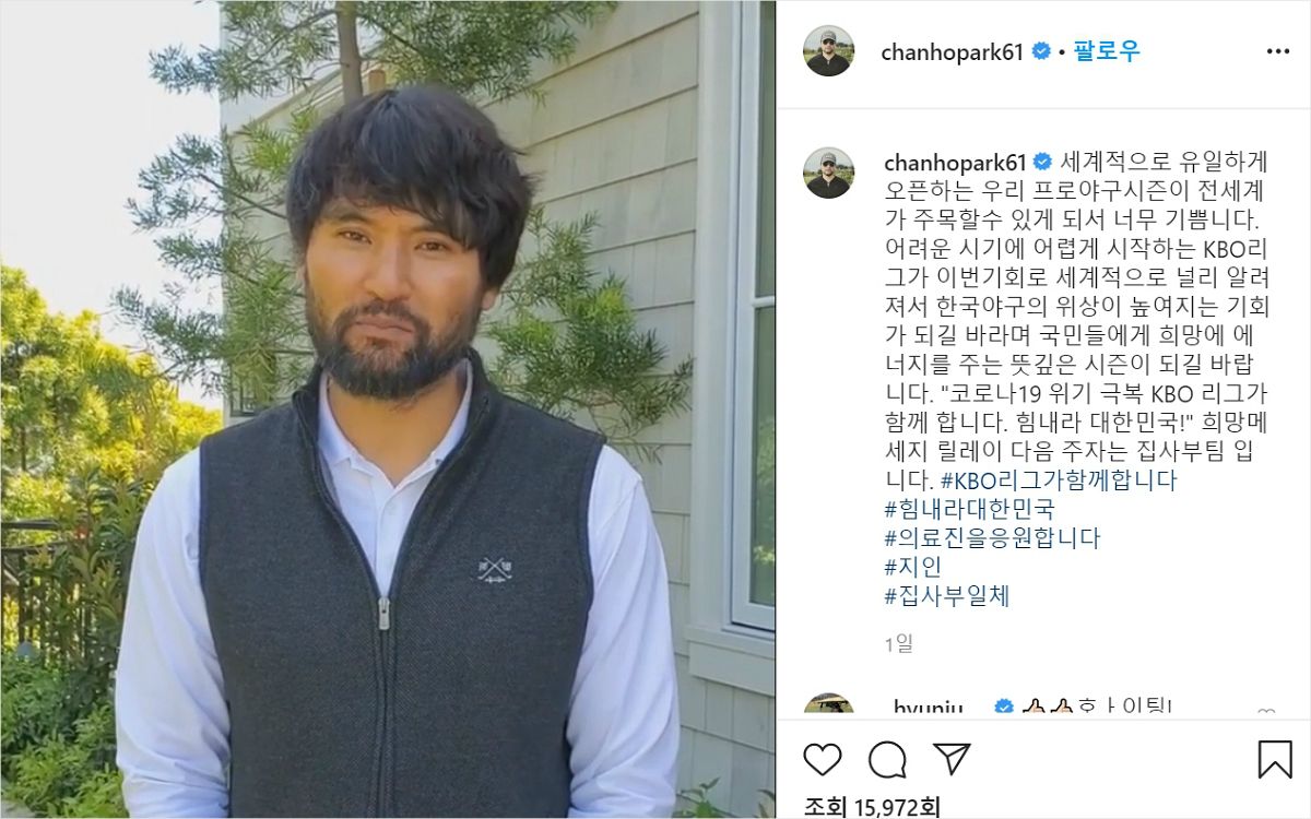 박찬호는 5일 자신의 인스타그램에 "세계적으로 유일하게 오픈하는 우리 프로야구 시즌을 전 세계가 주목 할 수 있게 돼 너무 기쁘다"며 축하를 전했다.