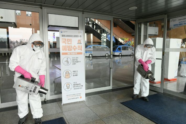 코로나19 예방을 위해 킨텍스 출입구에서 방역작업을 진행 중인 킨텍스 관계자들. (사진=킨텍스 제공)