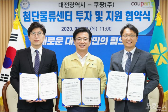 대전시-쿠팡 첨단물류센터 투자 및 지원 협약식. 왼쪽부터 강현오 쿠팡대전풀필먼트제일차 대표, 허태정 대전시장, 박대준 쿠팡 대표. (사진=대전시 제공)