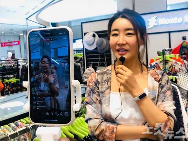 7일 롯데아울렛 수완점 한 매장에서 진행된 라이브 방송에서 의료 상품개발을 총괄하는 수석 디자이너가 방송에 직접 참여해 스타일을 제안하고 신상품을 선보이는 모습 (사진=롯데 아울렛 수완점 제공)