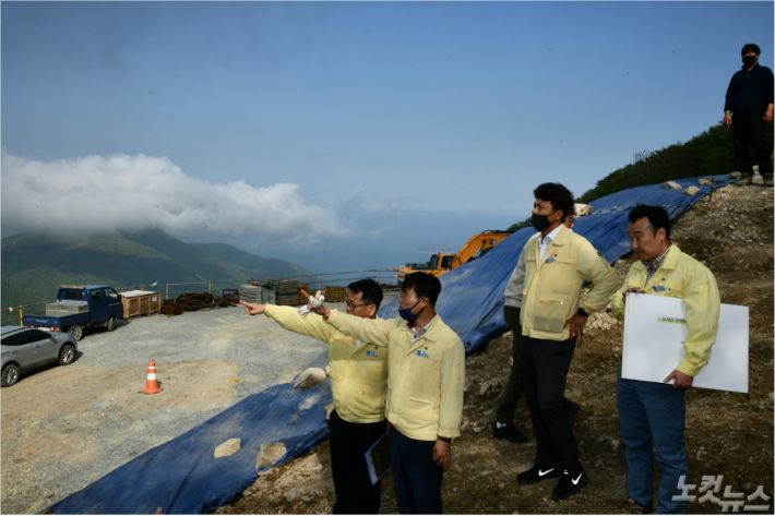 변광용 시장이 거제 파노라마 케이블카 공사 현장을 점검하고 있다. (사진=거제시청 제공)