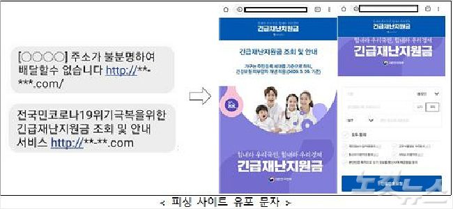 초기에 택배 사칭 문자 형태로 유포된 피싱 사이트는 이후 긴급재난지원금 내용으로 변경됐으며, 문자 내 인터넷 주소(URL)를 클릭하면 가짜 '긴급재난지원금 조회 및 안내' 사이트로 연결돼 이름과 전화번호, 생년월일 등의 정보를 입력하도록 유도한다.
