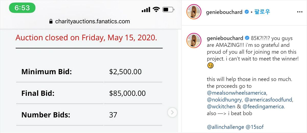 테니스 스타 유지니 부샤드(26·캐나다)와 데이트할 수 있는 기회가 경매로 나와 약 1억 480만 원에 낙찰됐다.