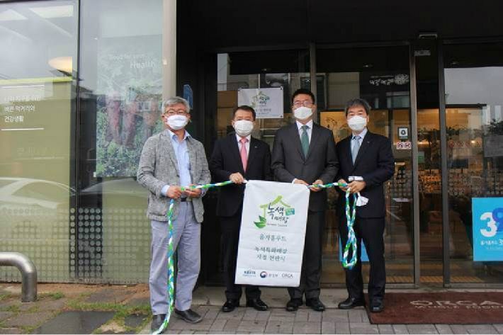 19일 올가홀푸드 방이점에서 열린 '녹색특화매장 시범운영 기념식'에서 참석자들이 녹색특화매장 지정 현판식을 마치고 기념촬영을 하고 있다. (사진=올가홀푸드 제공)