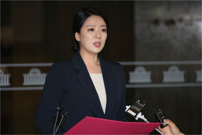 미래통합당 배현진 원내대변인이 21일 오후 국회 로텐더홀에서 미래통합당-미래한국당 합당 관련 브리핑을 하는 모습.(사진=연합뉴스)