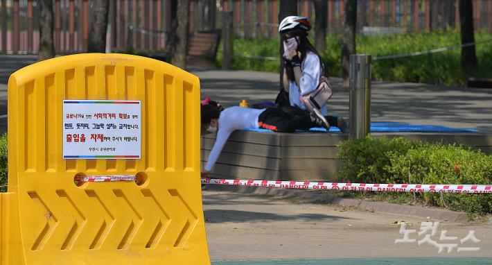 쿠팡 부천물류센터 관련 코로나19 확진자 속출로 부천시가 '생활 속 거리 두기' 체제에서 '사회적 거리 두기' 체제로 전환한 가운데 29일 오전 경기 부천시 상동호수공원에 사회적 거리 확보 안내문이 세워져 있다. 관내 체육시설은 6월 2일까지 개방하지 않는다.