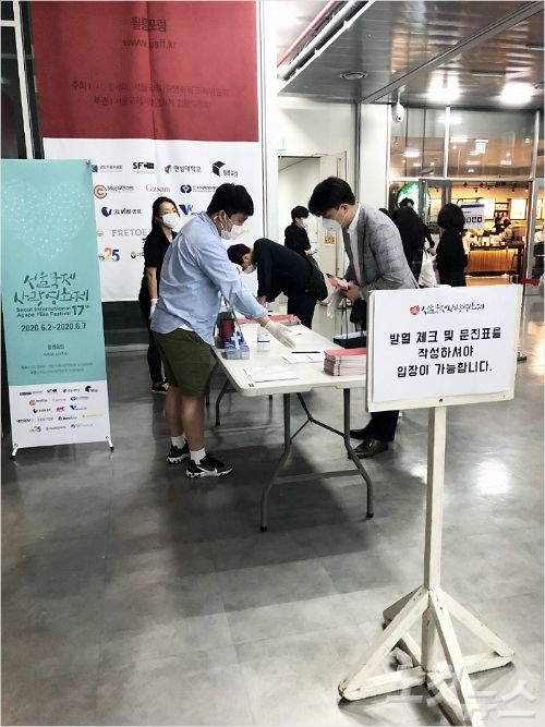 제17회 서울국제영화제 개막식 현장에서 발열 확인과 문진표 작성 등을 진행하고 있다.