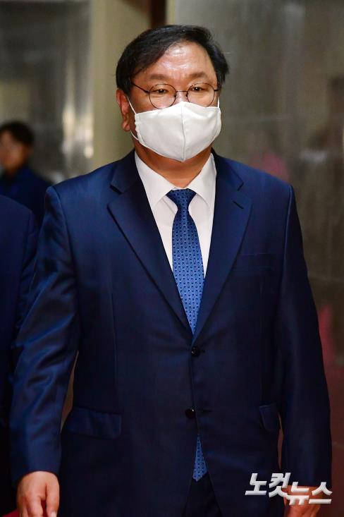 더불어민주당 김태년 원내대표가 7일 오후 국회에서 박병석 국회의장, 미래통합당 주호영 원내대표와 회동을 갖기 위해 의장실로 들어서고 있다.