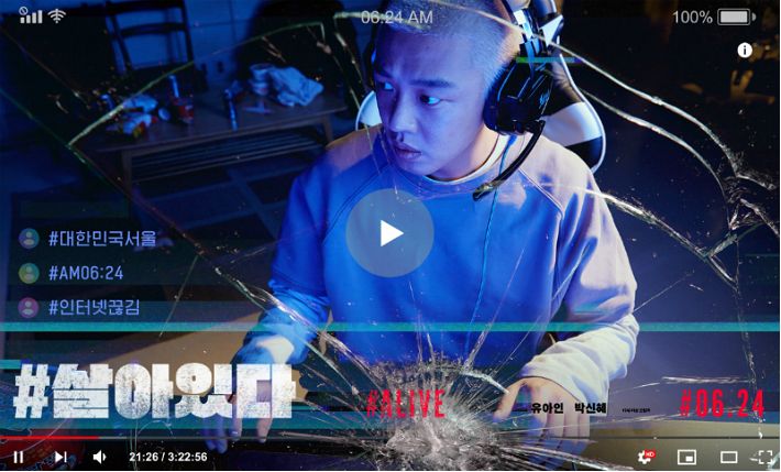 '#살아있다'(감독 조일형)는 원인불명 증세의 사람들이 공격을 시작하며 통제 불능에 빠진 가운데 데이터, 와이파이, 문자, 전화 모든 것이 끊긴 채 홀로 아파트에 고립된 이들의 이야기를 그린 생존 스릴러다.