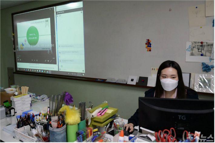 서울 성동구 도선고등학교 3학년 미술실에서 한 교사가 온라인으로 미술 창작수업을 시작하고 있다(사진=이한형 기자/자료사진)