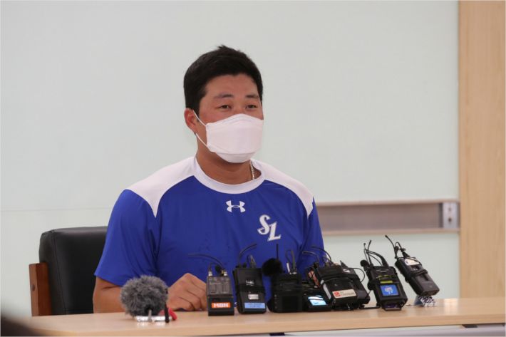 삼성 오승환이 9일 키움과 홈 경기에 앞서 7년 만의 복귀전 소감을 밝히고 있다.(대구=삼성)